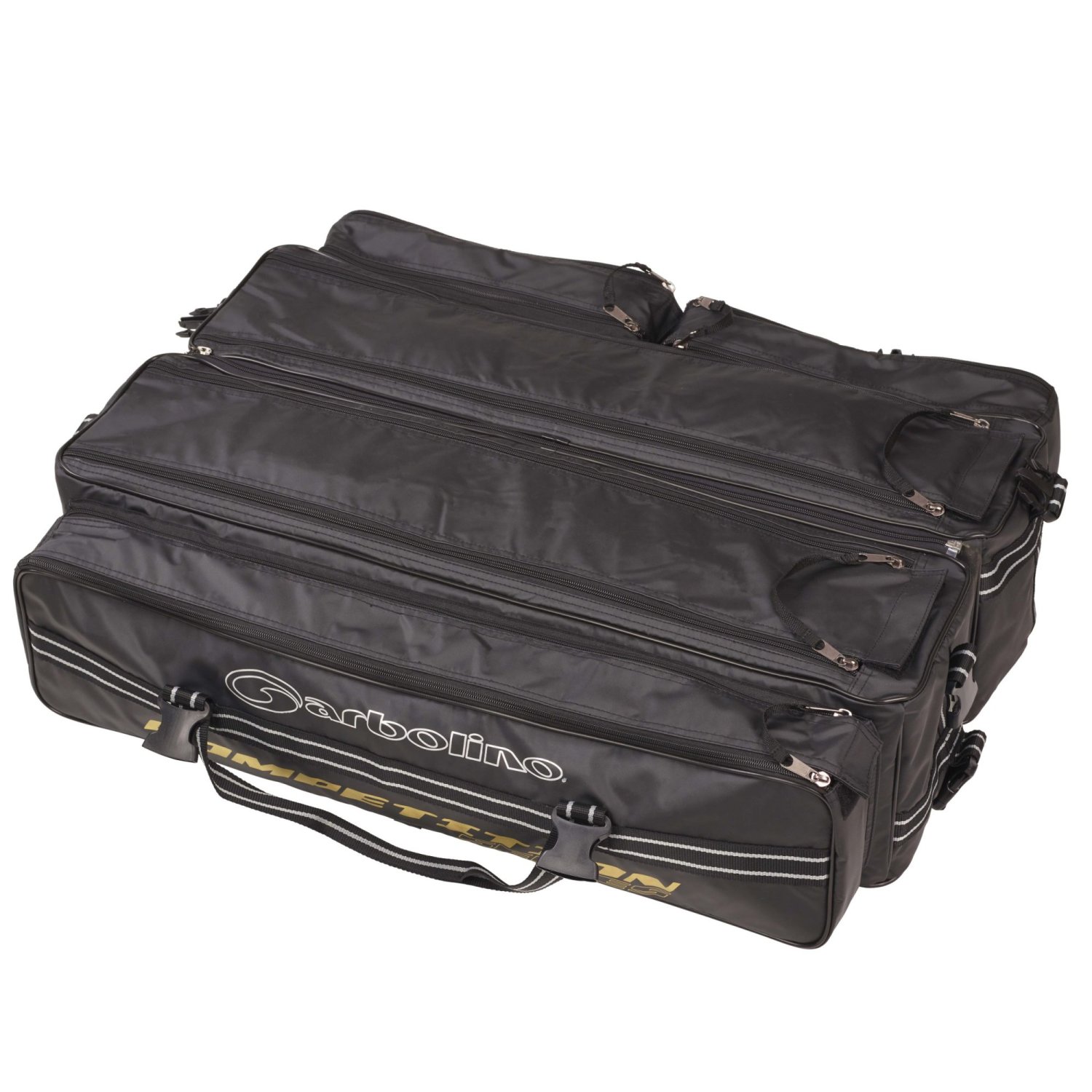 GOLD COMPETITION SERIES FOLDING CARRYALL TabsProduct OverviewFollowing the huge succes of the Challenger Foldout Carryall we have improved the design for the Competition Series! A carrying bag for the storage of all accessories. This new GARBOLINO exclusive design features two large central compartments, three side pockets which are all fully padded. Reinforced base and constructed from 100% waterproof PVC "Heavy Duty" canvas . Complete with carrying strap. Dimensions: 78cm x 40cm x 28cm Specification 100% Waterproof Five compartments in total Reinforced base Fully padded Carrying strap SKU: GOMLG3805 Price: £119.99
